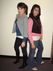 Ying Yang ’10 and Manisha Padi ’10 (the column writers) in their layered outfits. Yang is wearing skinny jeans from Express ($60), jacket from PacSun ($30), and sweater from H&M ($15). Padi is wearing jeans from Express ($40), vest from Dots ($10), and shirt from Aerie ($7). They are both wearing accessories from Aldo Accessories and shoes from Payless. Why we chose these: Layering up like this in the cold Boston weather allows us to be comfortable and look cute at the same time.