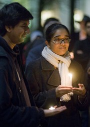 Anuja Mahashabde G joins members of the MIT community in Tuesday’s candlelight vigil in Killian Court for those killed and wounded in the terror attacks in Mumbai, India.