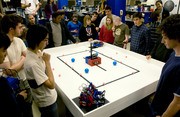 Contestants and organizers look on as two autonomous robots strive for the most points in the mock competition for 6.270 Autonomous Lego Robot Design. The final competition will be on Thursday, January 29 in 26-100 at 6 p.m.