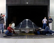 (left to right) David Sanchez ’09, Rachel Batzer ’11, Jessica Lin ’12, Kelly Ran ’12, Alejandro Arambula ’12, Ethan Huwe ’10, and Michael Roberts ’11 put the finishing touches on the Solar Electric Vehicle Team’s car Tuesday morning before a wind tunnel run at Jacobs Sverdrup in Dearborn, Michigan.