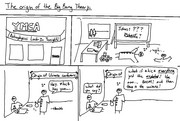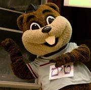 Tim the Beaver gets the crowd excited before the annual Latke-Hamentashen debate, held this year on Wednesday, March 4 in 26-100. The placard on his chest reads “MIT” in Hebrew.