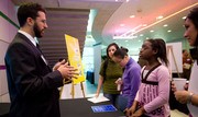 2009 Lemelson-MIT finalist Erez Lieberman G explains his invention, the iShoe, to a local middle school student, Mickaella Casseus. The iShoe can be placed in any shoe and wirelessly connects to a laptop to provide physicians with diagnostic information about the wearer’s sense of balance. Geoffrey von Maltzahn G won the Lemelson-MIT Student Prize, awarded to promising inventors, for his work on cancer therapy.