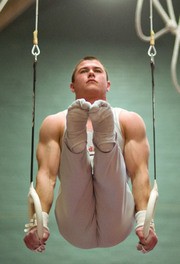 Thomas S. Caldwell ’09 does an L-seat on the rings during MIT’s match versus the College of William and Mary on March 13. The engineers lost 335.7-314.4 in their final home meet.