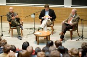 Atheist philosopher Peter Singer (professor of bioethics at Princeton University, left) addresses questions about morality and ethics last Saturday as Christian philosopher John Hare (professor of philosophical theology at Yale, right) looks on. Eric Gregory (assistant professor of religion at Princeton, center) moderated the discussion, which was part of MIT’s Veritas Forum. The event, organized by campus Christian organizations with help from Veritas Forum staff, invited prominent speakers to discuss ethics, beauty, and the relationship between science and faith.