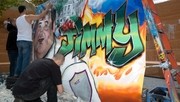 In 2006, members of the mural group Tats Cru finish a mural in honor of the late James E. “Big Jimmy” Roberts, former night watch man for the Senior House and East Campus dorms. The mural was created in the Stata Ampitheater and displayed at the 2006 Steer Roast as a memorial and to publicize the Big Jimmy Scholarship Fund.
