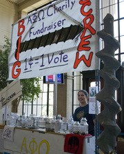 Rebecca E. Krentz-Wee ’11 mans the Lobby 10 booth for the Institute Screw Contest on Thursday. The contest is an annual charity fundraiser sponsored by Alpha Phi Omega that honors administrators or professors who are known for “screwing” over students. Chancellor Clay leads the pack with $136; next is Dan Frey with $112. Today is the last day to vote.
