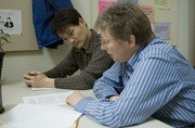 Writing tutor Susan Spilecki works on an essay with graduate student Masafumi Hashimoto on April 16. Institute-wide cuts could affect communication departments at MIT.
