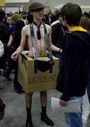 Kevin A. Fischer ’11 holds a discussion with a prospective student. He walked around wearing a cardboard box promoting “CryoFAC” in reference to the East Campus based group that served liquid nitrogen ice cream during the CPW festival on April 16.
