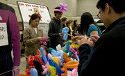 Members of ESP (Educational Studies Program) make balloon animals for prospective students at the CPW festival in the Johnson Ice Rink on Thursday night.