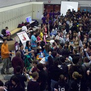 Prospective students gather around the ESP (Educational Studies Program) booth to catch free t-shirts that were thrown into the crowd in the Johnson Ice Rink during the CPW Festival on Thursday.