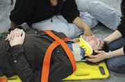 Prospective student Robert Haussman takes part in an EMT (Emergency Medical Technician) demonstration as part of the CPW festival on April 16.