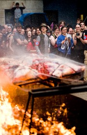 MIT’s Senior House held its annual Steer Roast party starting on May 1. The traditional kickoff involved using a roll of flaming toilet paper descended from the roof to light the steer-roasting pit, followed by mud wrestling.