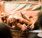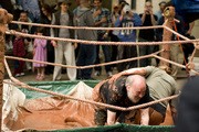 Erik D. Fogg G mud-wrestles Terral R. Jordan ’07 after the ignition of the roast pit during Senior House’s annual Steer Roast party on May 1.