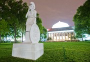 Hackers placed a giant statue of the Greek goddess Athena in MIT’s Killian Court on May 18, the first day of final exams. The Athena statue stood atop a large pedestal and carried a shield inscribed with MIT’s “Mens et Manus” logo. Athena is the goddess of knowledge, wisdom, heroic endeavor, and strategic warfare, as well as the name of MIT’s campus-wide computing system.