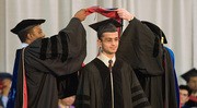 Nitish Nair G, PhD candidate for the Department of Chemical Engineering, receives his doctoral hood from department head Klavs F. Jensen at the Johnson Athletic Center midday Thursday.