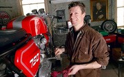 Matthew B. Crawford stands next to a 973 Ducati 750 GT in his motorcycle service shop in Richmond, VA. The portrait on the wall is of Winston Churchill.