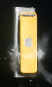 DURABILITY TESTING—A .22-caliber bullet fired by MIT Pistol Coach Will Hart Jr. hits the latest iPod Shuffle at the MIT Rifle Range. The strobe used to illuminate the shot was provided by Jim Bales of the Edgerton Center, who also helped set up the scene.