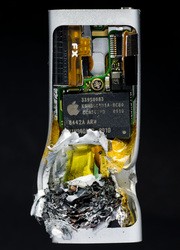 The busted iPod Shuffle is seen after its encounter with a .22 bullet. The ash seen in the lower part of the unit where the bullet struck is the Lithium battery.