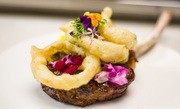 A 26 oz. T-bone steak with allium butter and fried onions is served in KO Prime style, decorated with flower petals.