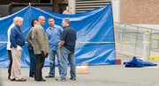 Emergency personnel, including MIT Police Captain Albert F. Pierce Jr. (center, facing right), investigate the death of Han D. Nguyen G, who was found in the parking lot on the east side of Building E19 on Tuesday, June 2. A tarp wall was constructed to shield the location where Nguyen fell (behind tarp to left).