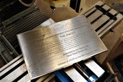 The Smoot 50th Anniversary Plaque is seen sitting on the vice of the Computer Numerical Controlled milling machine which worked it last Friday in the Hobby Shop in Building W31.