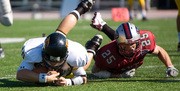 Defensive back Corey Garvey 10 makes a key tackle in Saturday’s game against Framingham State at Steinbrenner Stadium.