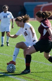 Alum Mary P. Harding ’07 (right) and Casandra N. Ceri ’13 vie for possession of the ball during the Engineers annual alumnae game on Saturday at Steinbrenner Stadium. The alumnae team, composed of past players and current seniors, lost 0-4.