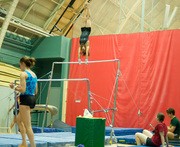 Zara K. Karuman ’13 performs a handstand on the uneven bars as her teammates look on during gymnastics practice on Thursday in DuPont. Due to budget cuts, the gymnastics team lost its varsity status at the end of last academic year and is now a club sport.