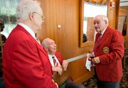 Members of the Class of 1954 (from left to right) Joseph Blake, Harvey Steinberg, and MIT President Emeritus Paul E. Gray reminisce at Legal Sea Foods on Wednesday after a memorial ceremony for the late Anna McAllister, a longtime hostess at the restaurant and friend to many in the MIT community.