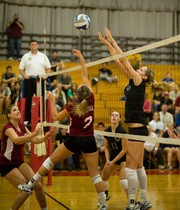 Senior captain Barden E. Cleeland attempts to block the ball during the second set of MIT’s varsity volleyball match against Springfield College. The Engineers topped the then-undefeated Pride 3-1 in Tuesday’s match.