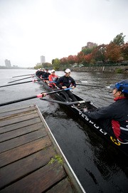 Members of the MIT Lightweight Men’s Varsity Crew launch from Pierce Boathouse Sunday before competing in the Head of the Charles. The two-day rowing event is one of the sport’s most celebrated.