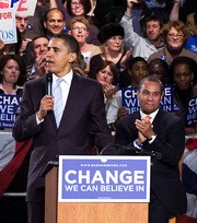 President Barack Obama will encourage Americans to lead the global economy in clean energy during his speech today in Kresge Auditorium at 12:30 p.m. Obama is pictured here with Governor Patrick during his campaign stop in Boston in February 2008.