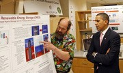 Professor Alexander H. Slocum ’82 presents his research on energy storage to United States President Barack Obama. Slocum explains a system for harnessing excess wind energy. When the wind is not blowing, water flowing into the storage area through a turbine produces electricity. When the wind is blowing, excess power is used to pump water out of the storage area.