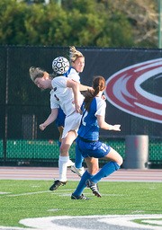 Forward Liz Theurer 10 successfully bounces a kick away from two Wheaton pursuers during a home game on Tuesday. The Engineers ultimately fell to the Lyons 2-0 during the shutout.