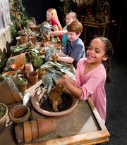 Kids pull out mandrakes in the Herbology area of the Harry Potter exhibit at the Museum of Science in Boston.