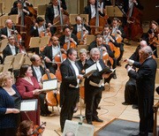 Lorin Maazel conducts the Boston Symphony Orchestra and the Tanglewood Festival Chorus in Beethoven’s Symphony No. 9, with (from left, foreground) soprano Christine Brewer, contralto Meredith Arwady, tenor Matthew Polenzani, and bass-baritone Eike Wilm Schulte.