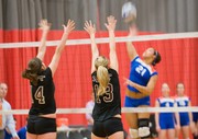 Senior captains Alexandra T. May and Barden E. Cleeland leap to block a spike by U.S. Coast Guard Academy’s Nicole Johnson in the NEWMAC women’s volleyball semi-finals last Friday at Rockwell Cage. The seniors each finished the match with 3 blocks, contributing to the Engineers’ 25-19, 25-20, 25-21 victory. On Saturday, the Engineers lost in the NEWMAC Championship match to Wellesley College, leaving MIT as the runner-up for the second time in three years.