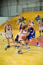 Erica N. Pino ’13 drives around a U.S. Coast Guard Academy defender in the first half of the women’s basketball game on December 2. The engineers were defeated 47-38.
