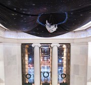 Hackers turned the ceiling of Lobby 7 into a giant “black hole” early on Saturday morning, complete with a crumpled CERN spaceship being sucked into the center (in reference to the Large Hadron Collider project).