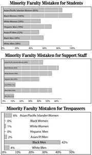 Percent of minority faculty who responded affirmatively to the question “In your daily encounters on the MIT campus, has anyone ever assumed that you were a student, support staff or trespasser?” Hispanic women are not included because of their small numbers.