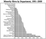 Underrepresented minorities hired from 1991–2009, by department. (Dual hires are counted at 50 percent in each department.)