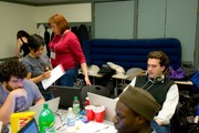 Team Codex Seraphinianus coordinate and work on problems Friday night during the Mystery Hunt. They were based in several rooms in Building 5 this year.