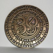 The 2010 Mystery Hunt coin was designed to look like a pocket watch, recalling the time travel theme of the Hunt. The obverse of the coin bears the inscriptions “2010 MIT History Mystery Hunt” and “It’s About Time.” The back includes all of the years used for additional rounds in the Hunt.
