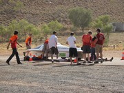 The MIT Solar Electric Vehicle team’s solar car, Eleanor, is being inspected at one of the control stops during the world solar challenge in Australia.