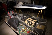 “Eleanor,” the MIT Solar Electric Vehicle Team’s current race vehicle, reveals the gear and cockpit mounted on her chassis. Her aerodynamic top and solar array are suspended on sawhorses (rear).