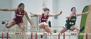 Portia M. Jones ’12 (left) and Hazel L. Briner ’11 (center) compete in the Women’s 55 Meter Hurdles at the MIT Coed Invitational held Saturday at the Johnson Indoor Track. Jones placed second with a time of 8.74 seconds.