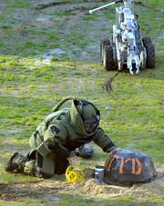 A Cambridge Bomb Squad officer attempts to disable a device placed on Kresge Field on the morning of April 24. The device was, in fact, a cherry-bomb-shaped concrete block advertising for the weekend’s annual “Dance ‘Til You Drop” party hosted by the Burton 3rd Bombers.