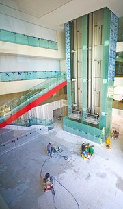 Workers began grinding the marble chunk-infused floor of the Media Lab extension’s central atrium on Nov. 2, which is now polished to a glossy finish. The expanse of interconnected airspaces surrounding the atrium necessitated smoke curtains (left) for emergency air evacuation, shown here closed for testing. The Media Lab extension opened in early December.