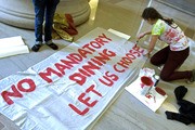 Carmel R. Dudley ’11 paints a banner reading “No Mandatory Dining / Let Us Choose!” that was hung in Lobby 7 during the Campaign For Students protest on Feb. 17. Students were protesting because of a leaked draft dining proposal from an MIT consultant that recommended mandatory meal plans.