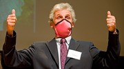 While wearing a brassiere over his mouth, Professor of Physics Wolfgang Ketterle, recipient of the Nobel Prize in Physics in 2001, gives two thumbs up to the winner of this year’s Ig Nobel Public Health Prize on Oct. 1. The winner, Dr. Elena N. Bodnar, created a bra that can be taken off and used as a “gas mask” in the event of an emergency. The Ig Nobel Prizes, held annually at Harvard University, are awarded to scientists for “achievements that first make people laugh, then think.”